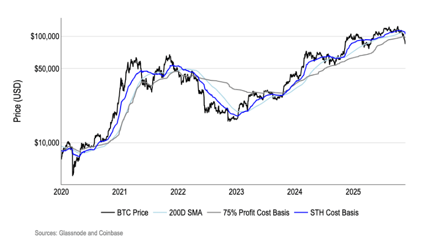 Bitcoin has breached every major support zone that previously stabilized prices during rallies. The asset now sits below the short-term holder cost basis, meaning recent buyers face losses. The 75% profit threshold that had historically provided support has failed to hold.