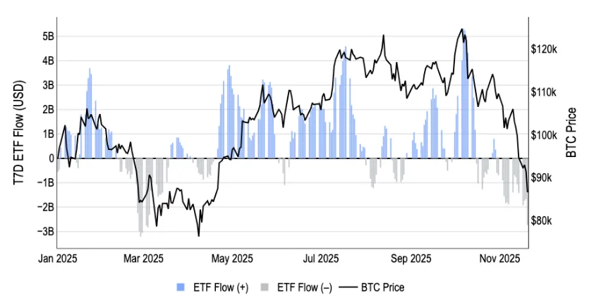 Spot Bitcoin ETFs recorded historic outflows during November 2025. The seven-day trailing sum turned sharply negative after price breakdowns accelerated. When investors redeem ETF shares, issuers must sell underlying Bitcoin holdings, amplifying market declines.