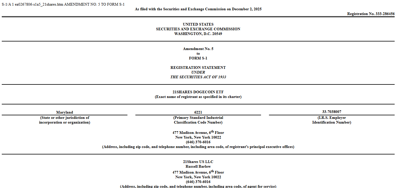21Shares has advanced its push toward a spot Dogecoin ETF launch in the U.S., adding fresh operational details and confirming its management fee in a new regulatory filing. The amendment brings clarity to the structure of the proposed TDOG fund as competition grows among issuers preparing Dogecoin products.