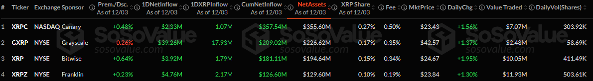 The products pulled in $89.65 million on December 1st, followed by an additional $67.7 million the subsequent day. Major asset managers Invesco and Franklin Templeton have submitted applications to launch their own XRP-focused ETF products.