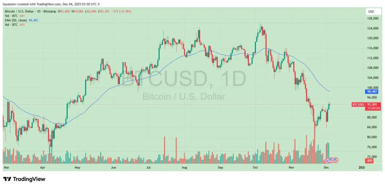 Price still trades well below the 50-day exponential moving average near 98,482 dollars, so the broader downtrend remains in place even after the recent rebound from November’s lows. However, buyers managed to hold most of last week’s gains, and the candle’s small body shows more of a pause than a clear rejection so far.