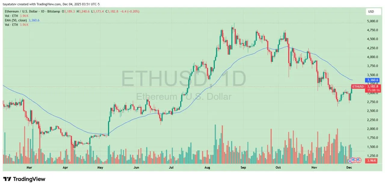 Ethereum followed a similar path. ETH/USD ended the session near 3,182.8 dollars, down from an open around 3,189.3 dollars, for a daily decline of about 0.20%.