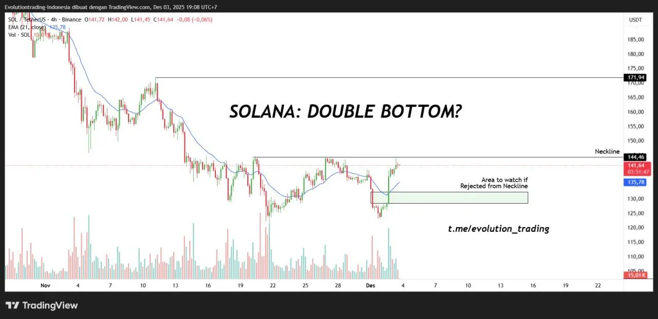 Kurnia Bijaksana also tracks the same structure. The analysis suggests a rally toward $170 if buyers clear the neckline. However, a rejection may return price to $128 to $132. Solana maintains micro support around $133 to $137, keeping the bullish case intact.