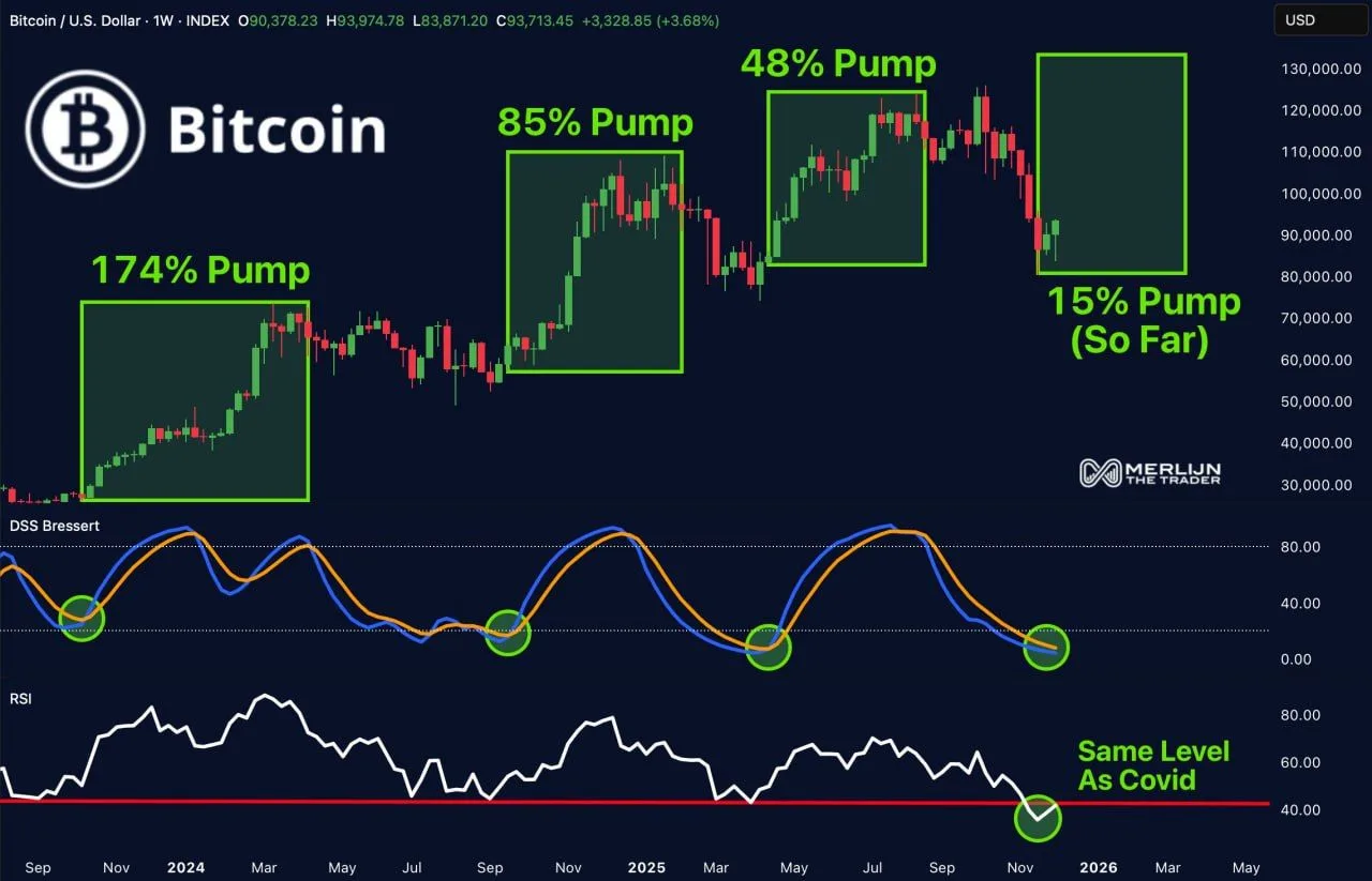 Meanwhile, A chart shared by analyst Merlijn The Trader shows Bitcoin repeating the same technical pattern that marked its last three major cycle lows. The weekly data highlights how previous bottoms formed when the Relative Strength Index reached its lowest band and the DSS Bressert indicator turned upward at the same time.