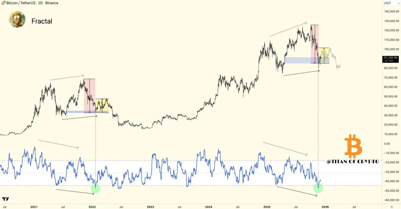 In the chart, Bitcoin’s price action forms a pattern that mirrors the earlier cycle, with a shaded support area marking the zone where the last major relief rally started. An accompanying momentum oscillator also shows a repeat of lower highs on price versus declining strength, followed by a deep reset into oversold territory, just as it did before the 2022 bounce.