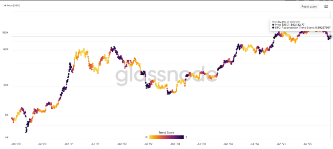 Glassnode's accumulation trend score for Bitcoin approaches 1, signaling intense buying pressure from major investors. This metric tracks whether large holders are net buyers or sellers. Values near 1 indicate strong accumulation, while readings close to 0 suggest a more even distribution.