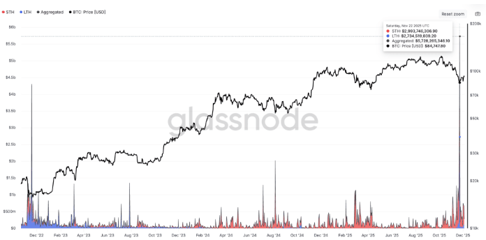 Bitcoin's recent drawdown generated the largest spike in realized losses since the FTX collapse in late 2022. Short-term holders realized $3 billion in losses on November 22. Long-term holders recorded $1.78 billion in losses during the same period.