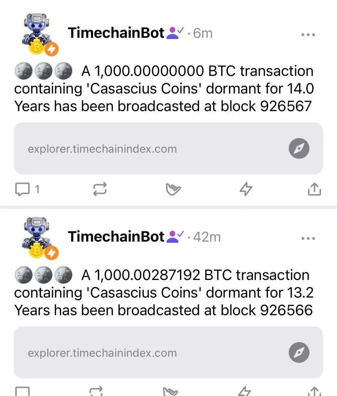 Two large batches of Bitcoin linked to Casascius physical coins have moved on-chain after sitting dormant for more than 13 years, according to alerts from TimechainBot. The bot reported that transactions of about 1,000.00287192 BTC and 1,000 BTC were broadcast in consecutive blocks 926,566 and 926,567, ending a long period of inactivity for the addresses.