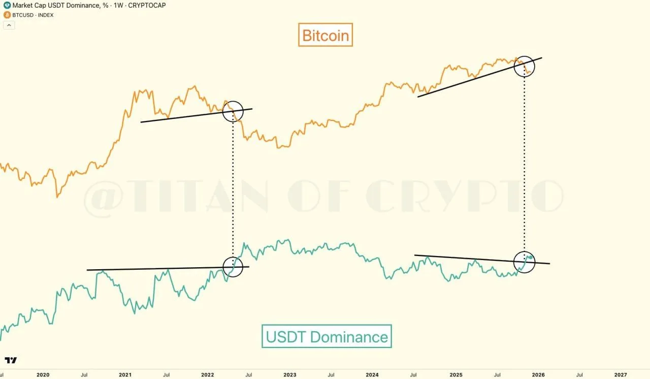 Titan of Crypto says Bitcoin may have entered a bear market in the first week of November, based on a divergence between BTC price action and USDT dominance. In his chart, Bitcoin’s weekly trend line slopes upward while USDT’s share of the crypto market begins to turn higher from a falling line, echoing a similar pattern that appeared before the 2021 cycle peak.