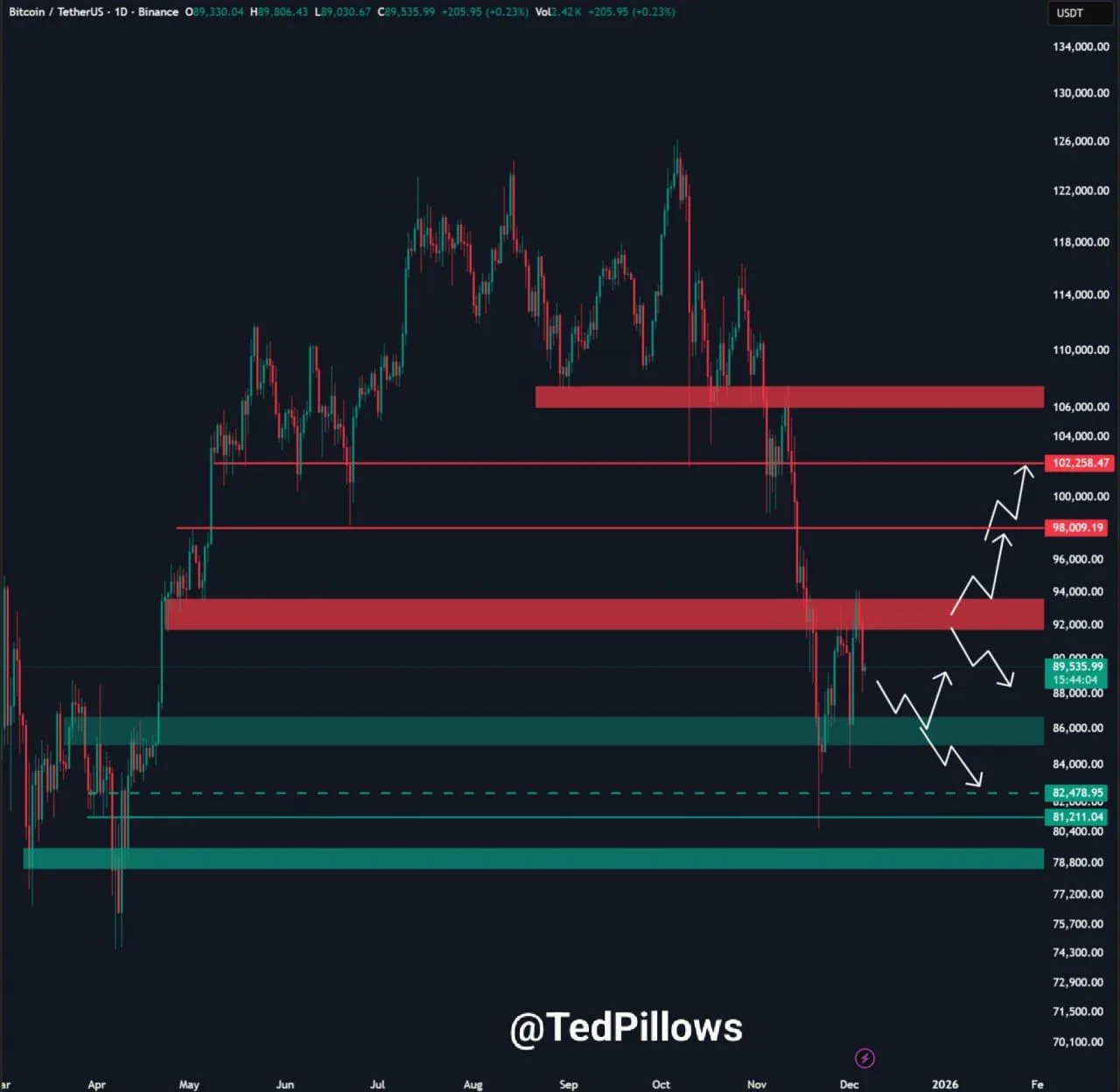 Meanwhile, Bitcoin bounced after retesting support near the 88,000-dollar area, but trader Ted Pillows says the move remains fragile while price trades under 90,000 dollars. He views 90,000 dollars as a short-term pivot: a clean break and daily close above that level would confirm that buyers have regained control and open room toward the next resistance band around the low-90,000s. The chart shows stacked supply zones above, with heavier resistance sitting closer to 98,000–102,000 dollars.