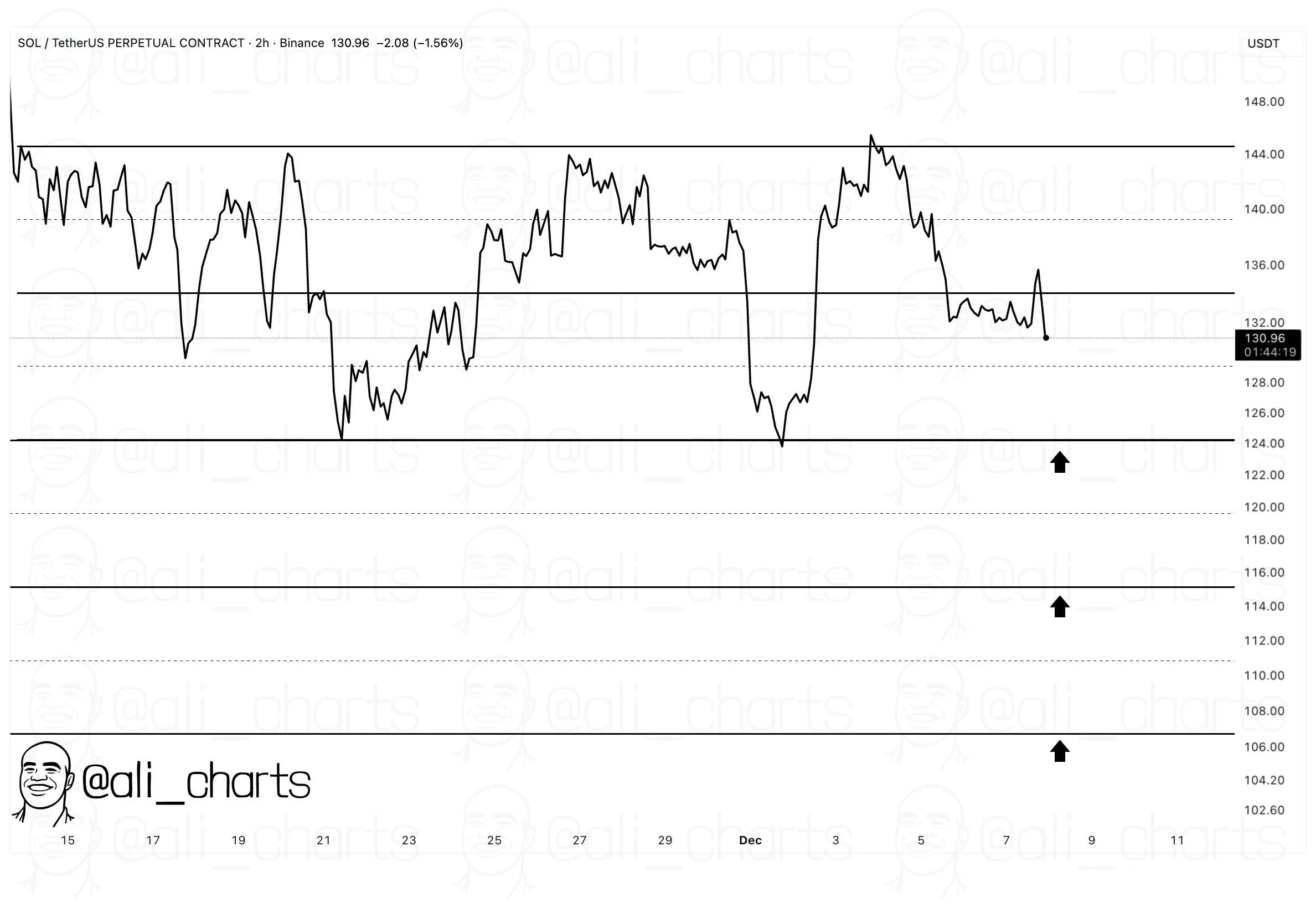 Analyst Ali Martinez noted that Solana must hold $124 to avoid deeper losses toward $115 or $106. The chart currently shows price moving near $131 after failing to secure a close above $136.