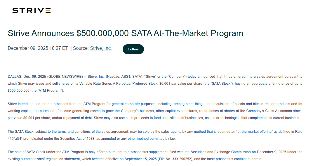 Strive said on Tuesday that it plans to allocate proceeds from the offering toward general corporate purposes. A key part of that strategy includes buying more Bitcoin and Bitcoin-related products, as well as investing in unspecified income-generating assets to support long-term business growth.
