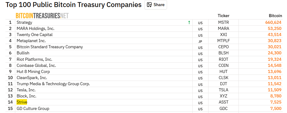 Strive very firmly aligned itself with the corporate Bitcoin treasury strategy that was pioneered by Michael Saylor’s Strategy, which normalized the idea of publicly traded companies using equity markets to accumulate BTC as a balance-sheet reserve asset. With 7,525 BTC currently held, which is worth roughly $694 million at today’s price, Strive now ranks as the 14th-largest corporate holder of Bitcoin.