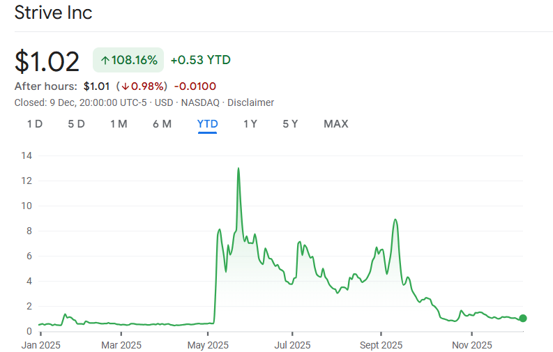 Strive’s rise in the sector comes alongside growth in its asset-management business. Since launching its first exchange-traded fund (ETF) in August of 2022, the company accumulated over $2 billion in assets under management. Investor appetite seems to reflect that momentum. Strive’s stock (ASST) climbed 3.6% on Tuesday to close at $1.02, more than doubling in value since the start of the year.