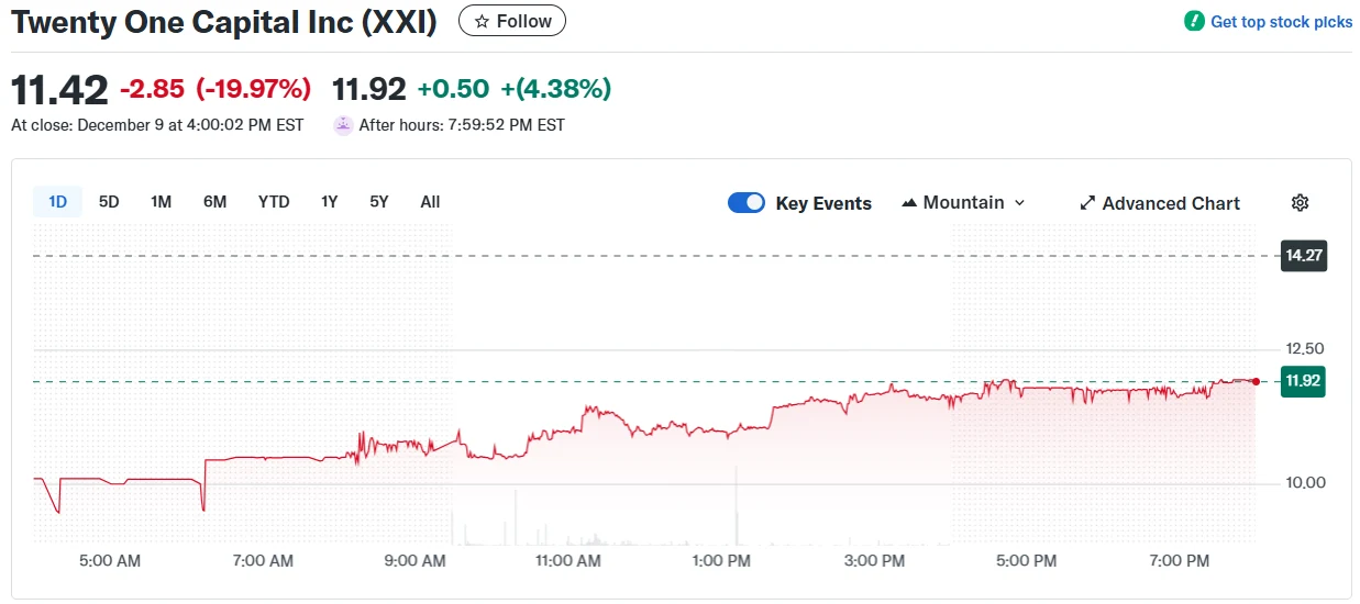 Twenty One Capital share price over the past 24 hours (Source: Yahoo Finance)