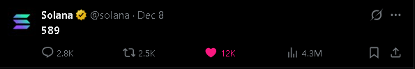 A similar moment surfaced just days earlier when Solana’s official X account posted the number “589” with no explanation. That post drew more than 4.3 million views and created unusual engagement between the XRP and Solana communities. Market watchers questioned whether Solana teased a possible connection involving Ripple’s RLUSD stablecoin. Others suspected Solana attempted to attract XRP’s highly active audience.