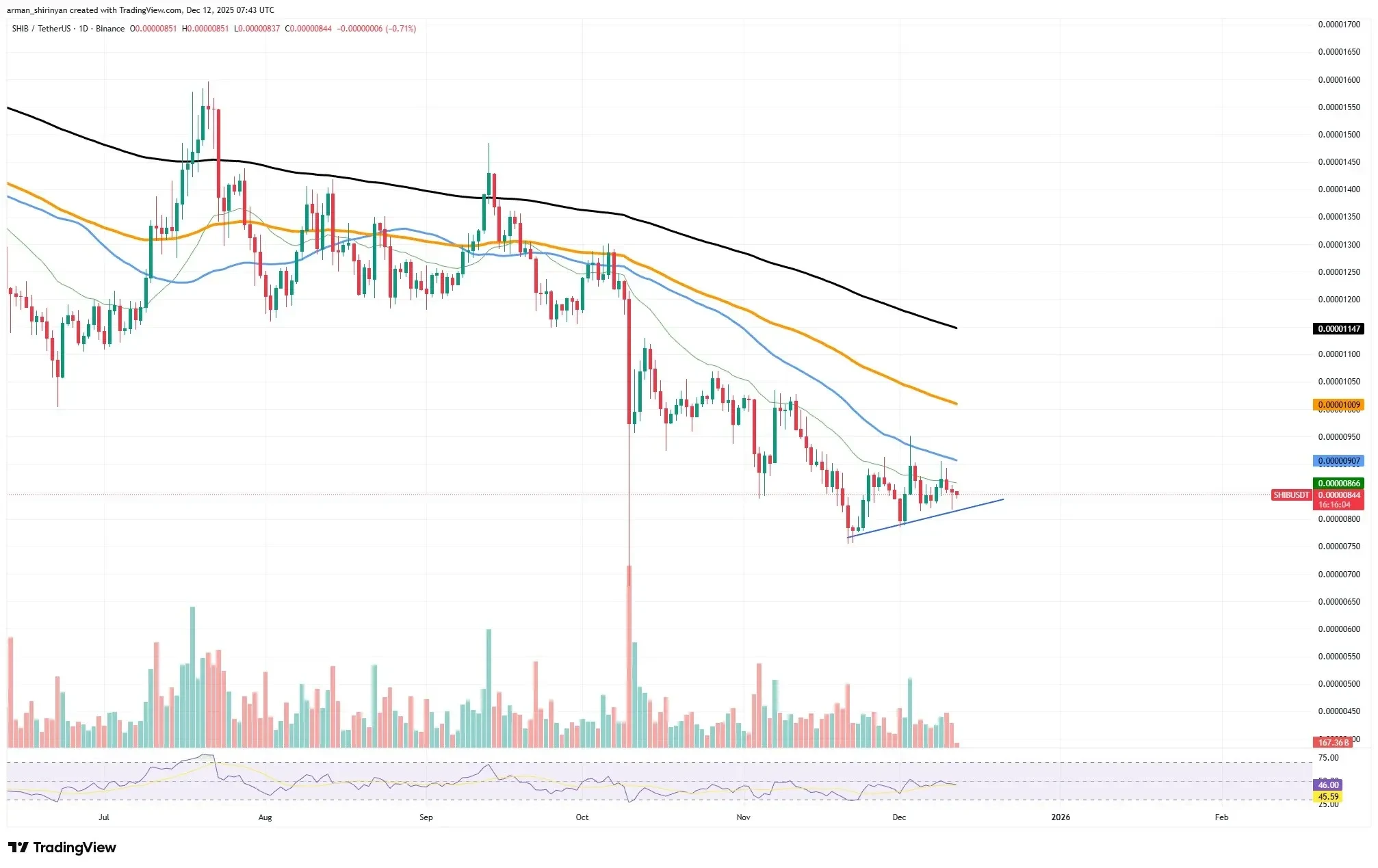 The Relative Strength Index holds neutral territory without entering deep oversold zones. SHIB maintains a position above its most recent local lows, creating potential for a relief bounce. However, buyers must prove themselves capable of pushing through resistance at the declining 50 EMA.
