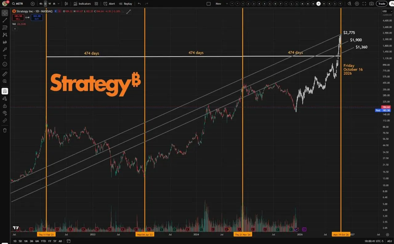 Meanwhile, a chart shared by trader Ryan Hogue plots Strategy’s MSTR share price inside a rising channel and marks three equal spans of 474 days between major inflection points. The first interval runs from the early 2021 peak to the start of 2023, while the second stretches into late November 2024. Now the chart projects a third 474-day window that extends to mid-October 2026.