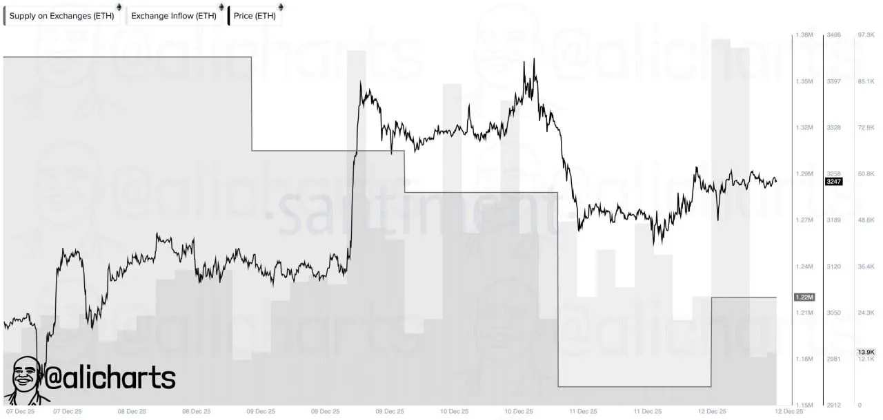 A chart attributed to Santiment alongside the post showed ETH trading near $3,247 at the latest reading. The same chart showed exchange supply around 1.22 million ETH, after a sharp step down earlier in the week and a smaller rebound near the end of the period.