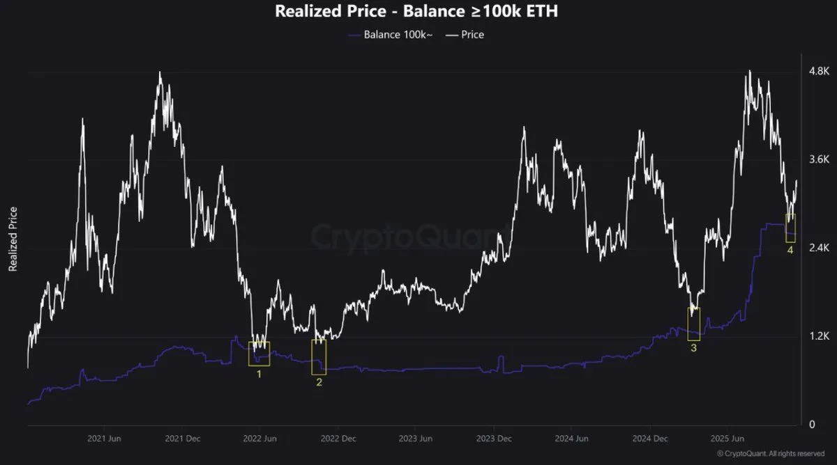 Ethereum has moved very close to the realized price of large whale wallets holding at least 100,000 ETH, marking only the fourth such instance since 2020, according to data shared by analyst Rand, known as @cryptorand, citing CryptoQuant.