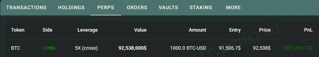 The position shows a 5x leveraged long on the BTC USD pair with an entry price near 91,506 dollars and a position value listed at roughly 92.5 million dollars. At the time the data was captured, the trade showed an unrealized profit of more than 1 million dollars as Bitcoin traded above 92,500 dollars.