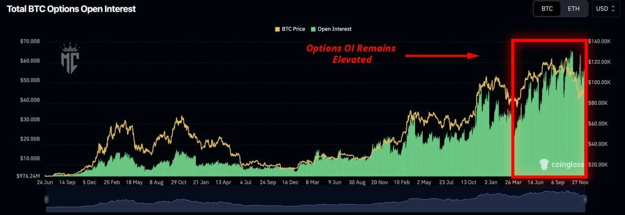 Bitcoin Options Open Interest Chart. Source: CoinGlass via Mister Crypto on XThe chart shows total Bitcoin options open interest rising alongside price over recent months, with notional exposure staying high as BTC trades near upper ranges. Open interest measures the total value of outstanding options contracts and often reflects how much leverage and risk traders hold across the market.