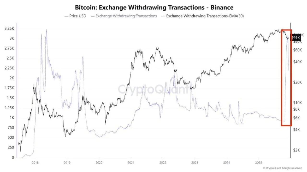 Bitcoin exchange withdrawal activity on Binance increased sharply near the 91,000-dollar level, according to data published by CryptoQuant and shared by Bitcoin Archive on X.