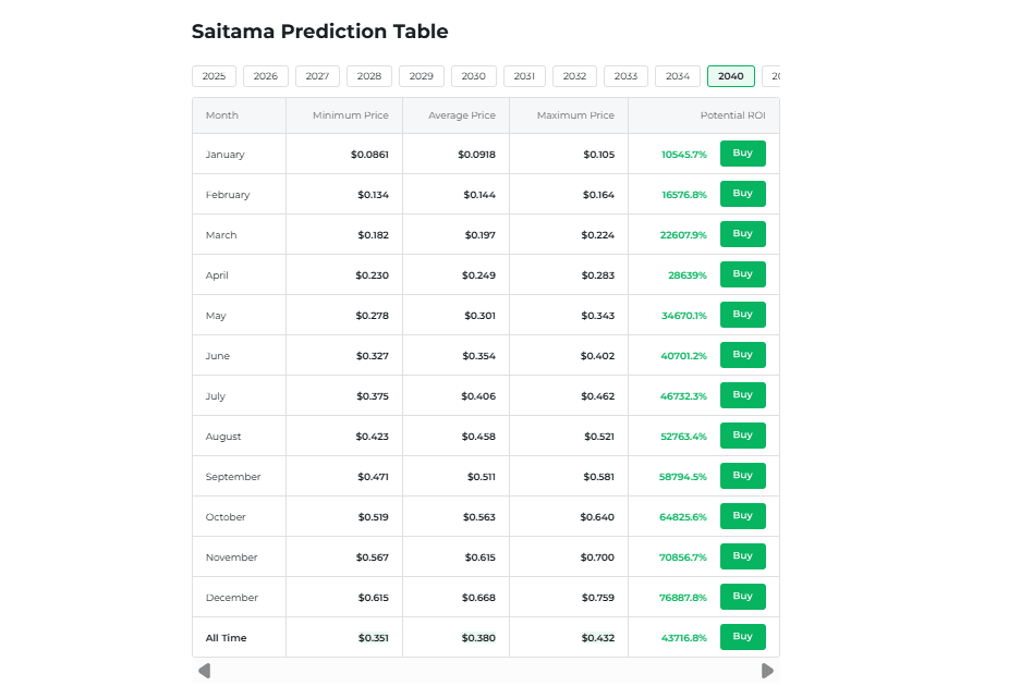 Looking further ahead, predictions for Saitama Inu in 2030 indicate a possible price range between $0.00583 and $0.00980. The longer-term outlook appears mixed, showing potential for growth based on future developments. By the end of 2040, Saitama could hit $0.759.